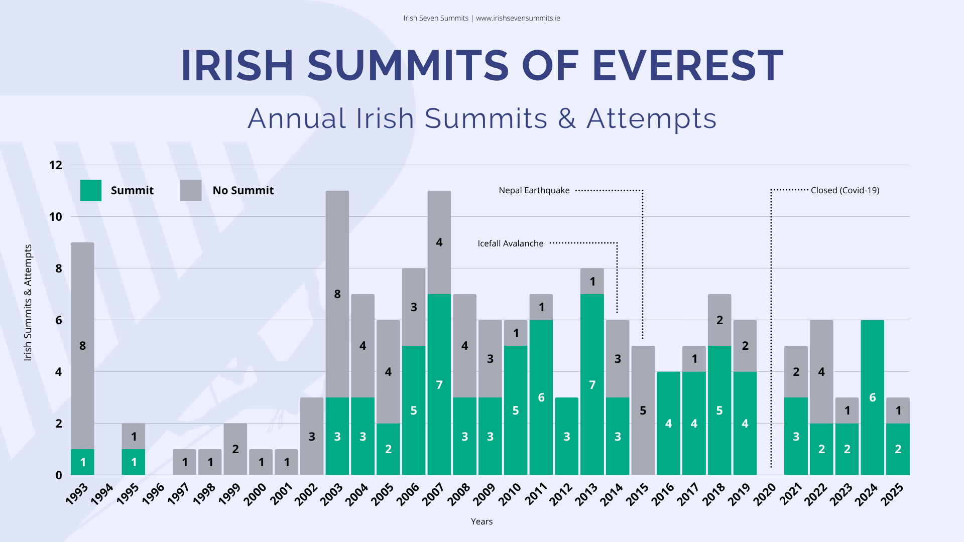 From an Irish perspective (North & South), Everest has been climbed 84 times by 65 Irish climbers (9 women, 56 men), with a total of 156 Irish attempts to date by 107 different climbers. A full list of all Irish climbers who climbed or attempted Everest can be found here. Climbing has a long and proud tradition as a cross-community activity in Ireland, and so we honour that tradition by including all climbs from North and South in our data and insights.