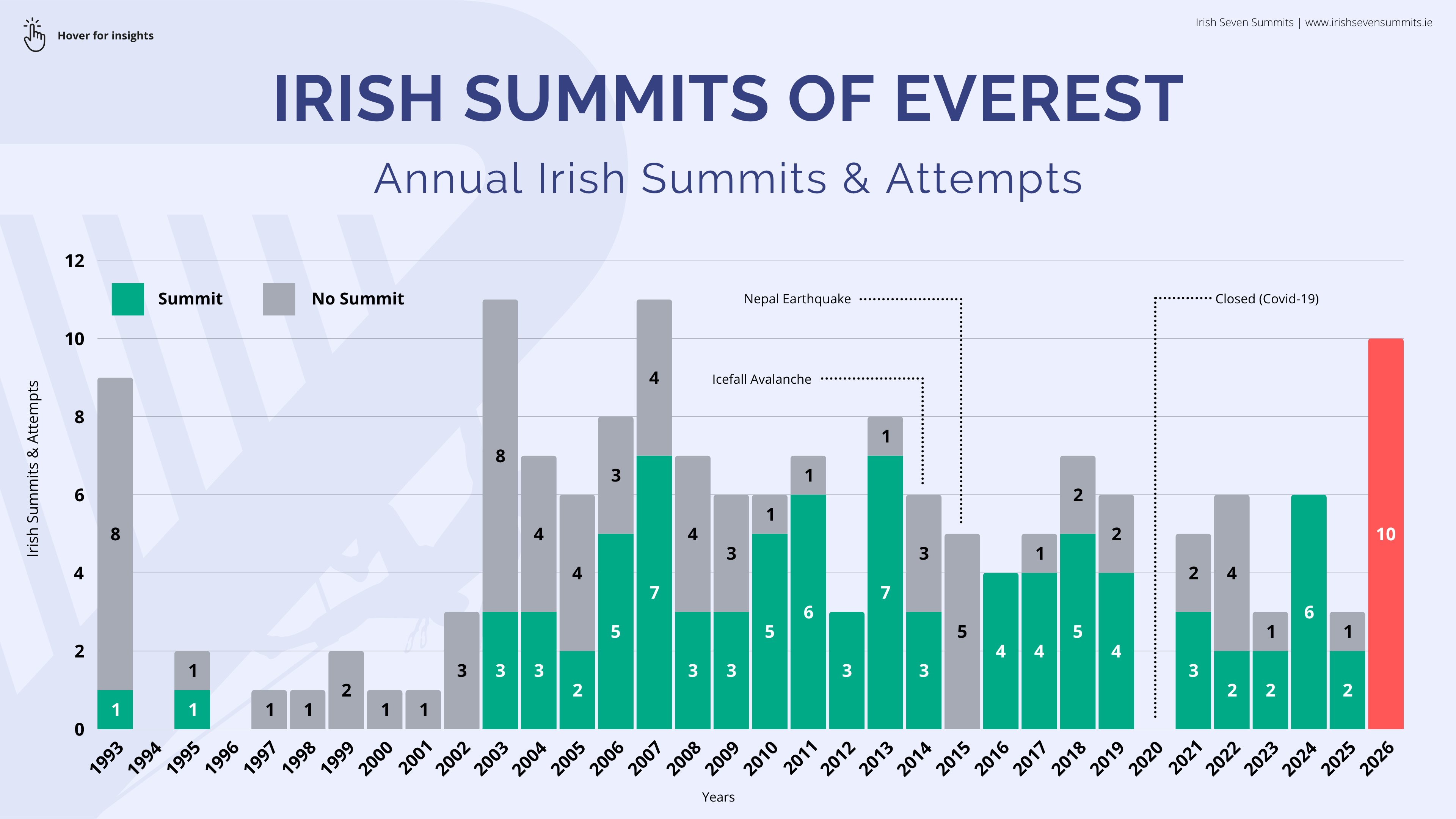 From an Irish perspective (North & South), Everest has been climbed 84 times by 65 Irish climbers (9 women, 56 men), with a total of 156 Irish attempts to date by 107 different climbers. A full list of all Irish climbers who climbed or attempted Everest can be found here. Climbing has a long and proud tradition as a cross-community activity in Ireland, and so we honour that tradition by including all climbs from North and South in our data and insights.